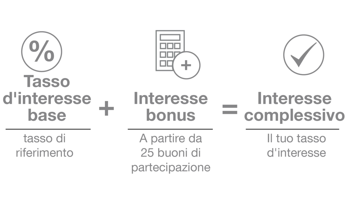 Per partecipare basta avere almeno 25 buoni di partecipazione nel tuo deposito: in questo modo riceverai il bonus sugli interessi dello BSK e otterrai così un totale dello del tasso d’interesse su un importo massimo di 100 000 CHF. Il bonus è valido fintanto che mantieni il tuo investimento.